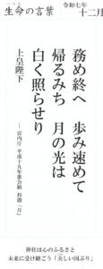 生命の言葉(12月) 2025/12/7 生命の言葉 毎年同じ言葉を使いづづけているが、今年もあと一か月。 2025年もあっという間だった。 ジャネーの法則の法則によると、6歳と60歳では10倍の時間感覚の差があるらしい。 最近は姪っ子の1人が結婚して、もう一人の姪っ子には子供ができた。 年取るはずだよ。 今年もいろいろやり残していることが多いが、少しでも完了しておきたい。